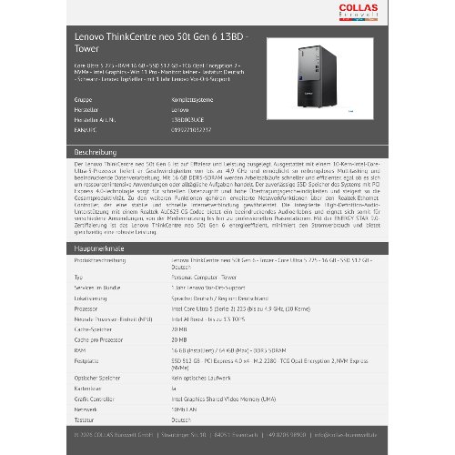 Jetzt anmeldenProduktinformationen "Lenovo ThinkCentre neo 50t Gen 6 13BD - Tower"