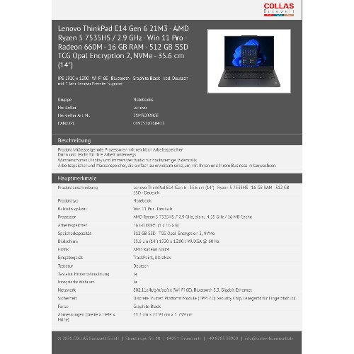 Jetzt anmeldenProduktinformationen "Lenovo ThinkPad E14 Gen 6 21M3 - AMD Ryzen 5 7535HS / 2.9 GHz - Win 11 Pro - Radeon 660M - 16 GB RAM - 512 GB SSD TCG Opal Encryption 2, NVMe - 35.6 cm (14")"