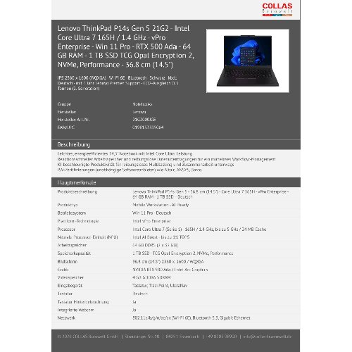 Lenovo ThinkPad P14s Gen 5 21G2 - Intel Core Ultra 7 165H / 1.4 GHz - vPro Enterprise - Win 11 Pro - RTX 500 Ada - 64 GB RAM - 1 TB SSD TCG Opal Encryption 2, NVMe, Performance - 36.8 cm (14.5")