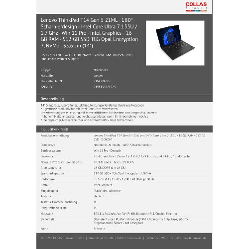 Jetzt anmeldenProduktinformationen "Lenovo ThinkPad T14 Gen 5 21ML - 180°-Scharnierdesign - Intel Core Ultra 7 155U / 1.7 GHz - Win 11 Pro - Intel Graphics - 16 GB RAM - 512 GB SSD TCG Opal Encryption 2, NVMe - 35.6 cm (14")"