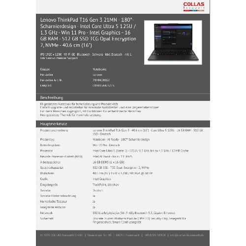 Jetzt anmeldenProduktinformationen "Lenovo ThinkPad T16 Gen 3 21MN - 180°-Scharnierdesign - Intel Core Ultra 5 125U / 1.3 GHz - Win 11 Pro - Intel Graphics - 16 GB RAM - 512 GB SSD TCG Opal Encryption 2, NVMe - 40.6 cm (16")"