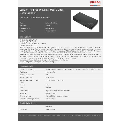 - 3840x2160@ 60 Hz (Max)2 x DisplayPort, 1x HDMI3 x USB 3.2 Gen 2, 2 x USB 2.0, 1 x USB-C1 x Gigabit EthernetINTELLIGENTER ARBEITEN Vorstellung des ThinkPad Universal USB-C-Dock. Mit dieser fortschrittlichen, universell kompatiblen Ein-Kabel-Docking-Lösung können Sie intelligenter und nicht härter arbeiten. Sie bietet eine große Auswahl an Anschlüssen, Plug-and-Play-Funktionalität der nächsten Generation und Schnellladefunktionen (bis zu 100 W für die meisten USB-C-Notebooks). Sie ist intelligent genug, um wichtige Firmwareaktualisierungen automatisch zu installieren.Sie eignet sich optimal für eine gemischte PC-Umgebung und die Arbeit zu Hause. Zudem haben Sie die Möglichkeit, mehr zu tun.;; Das 90-W-Netzteil lädt ThinkPad und andere USB-C-Notebooks bis zu 65 W. Zum Laden mit 100 W ist ein optionales Slim Tip 135-W-Netzteil erforderlich (PN: 4X20E50558 (US)/4X20E505xx). Separat erhältlich.Um zu überprüfen, ob die Dockinglösung mit Ihrem System kompatibel ist,Für die Konfiguration von Display- und Videoausgängen.