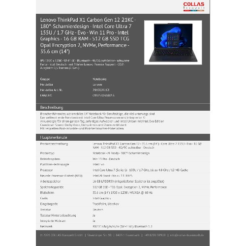 Jetzt anmeldenProduktinformationen "Lenovo ThinkPad X1 Carbon Gen 12 21KC - 180°-Scharnierdesign - Intel Core Ultra 7 155U / 1.7 GHz - Evo - Win 11 Pro - Intel Graphics - 16 GB RAM - 512 GB SSD TCG Opal Encryption 2, NVMe, Performance - 35.6 cm (14")"