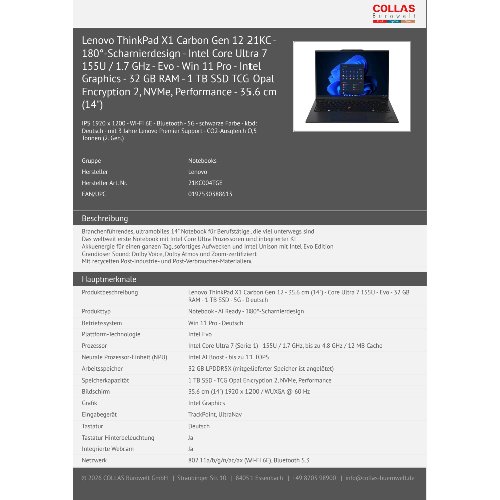 Jetzt anmeldenProduktinformationen "Lenovo ThinkPad X1 Carbon Gen 12 21KC - 180°-Scharnierdesign - Intel Core Ultra 7 155U / 1.7 GHz - Evo - Win 11 Pro - Intel Graphics - 32 GB RAM - 1 TB SSD TCG Opal Encryption 2, NVMe, Performance - 35.6 cm (14")"