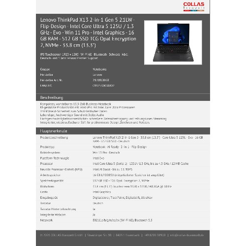 Jetzt anmeldenProduktinformationen "Lenovo ThinkPad X13 2-in-1 Gen 5 21LW - Flip-Design - Intel Core Ultra 5 125U / 1.3 GHz - Evo - Win 11 Pro - Intel Graphics - 16 GB RAM - 512 GB SSD TCG Opal Encryption 2, NVMe - 33.8 cm (13.3")"