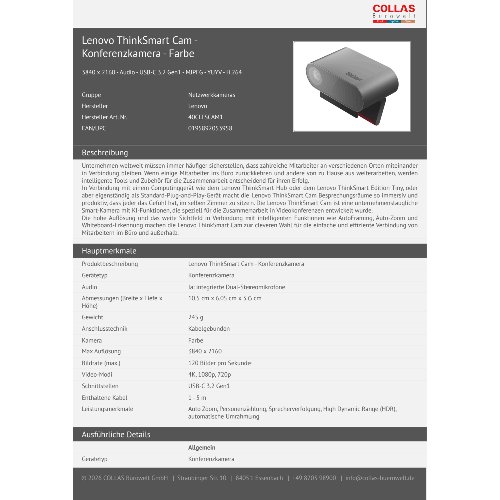 - Unternehmen weltweit müssen immer häufiger sicherstellen, dass zahlreiche Mitarbeiter an verschiedenen Orten miteinander in Verbindung bleiben. Wenn einige Mitarbeiter ins Büro zurückkehren und andere von zu Hause aus weiterarbeiten, werden intelligente Tools und Zubehör für die Zusammenarbeit entscheidend für ihren Erfolg.In Verbindung mit einem Computinggerät wie dem Lenovo ThinkSmart Hub oder dem Lenovo ThinkSmart Edition Tiny, oder aber eigenständig als Standard-Plug-and-Play-Gerät macht die Lenovo ThinkSmart Cam Besprechungsräume so immersiv und produktiv, dass jeder das Gefühl hat, im selben Zimmer zu sitzen. Die Lenovo ThinkSmart Cam ist eine unternehmenstaugliche Smart-Kamera mit KI-Funktionen, die speziell für die Zusammenarbeit in Videokonferenzen entwickelt wurde.Die hohe Auflösung und das weite Sichtfeld in Verbindung mit intelligenten Funktionen wie AutoFraming, Auto-Zoom und Whiteboard-Erkennung machen die Lenovo ThinkSmart Cam zur cleveren Wahl für die einfache und effiziente Verbindung von Mitarbeitern im Büro und außerhalb.