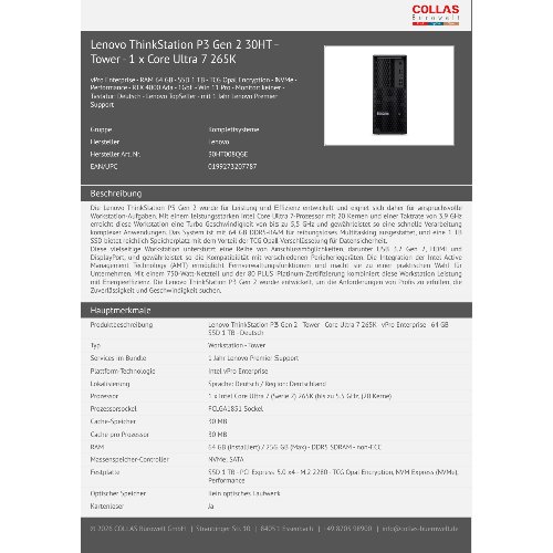Jetzt anmeldenProduktinformationen "Lenovo ThinkStation P3 Gen 2 30HT - Tower - 1 x Core Ultra 7 265K"