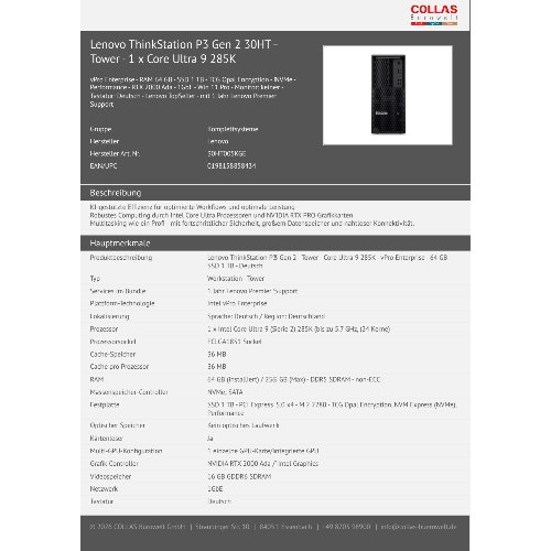 Jetzt anmeldenProduktinformationen "Lenovo ThinkStation P3 Gen 2 30HT - Tower - 1 x Core Ultra 9 285K"