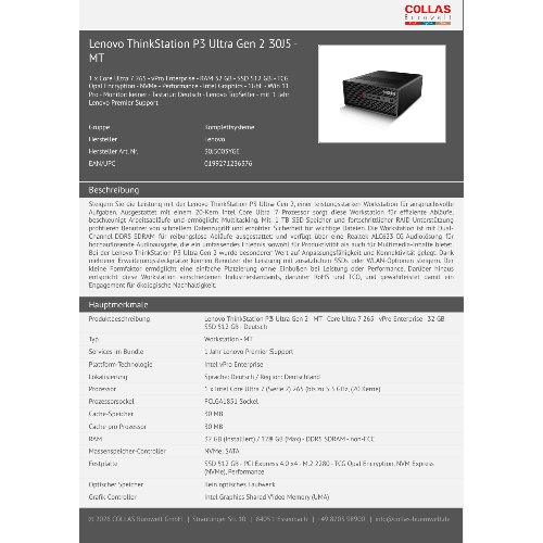 - Steigern Sie die Leistung mit der Lenovo ThinkStation P3 Ultra Gen 2, einer leistungsstarken Workstation für anspruchsvolle Aufgaben. Ausgestattet mit einem 20-Kern Intel Core Ultra 7 Prozessor sorgt diese Workstation für effiziente Abläufe, beschleunigt Arbeitsabläufe und ermöglicht Multitasking. Mit 1 TB SSD-Speicher und fortschrittlicher RAID-Unterstützung profitieren Benutzer von schnellem Datenzugriff und erhöhter Sicherheit für wichtige Dateien. Die Workstation ist mit Dual-Channel-DDR5-SDRAM für reibungslose Abläufe ausgestattet und verfügt über eine Realtek ALC623-CG-Audiolösung für hochauflösende Audioausgabe, die ein umfassendes Erlebnis sowohl für Produktivität als auch für Multimedia-Inhalte bietet. Bei der Lenovo ThinkStation P3 Ultra Gen 2 wurde besonderer Wert auf Anpassungsfähigkeit und Konnektivität gelegt. Dank mehrerer Erweiterungssteckplätze können Benutzer die Leistung mit zusätzlichen SSDs oder WLAN-Optionen steigern. Der kleine Formfaktor ermöglicht eine einfache Platzierung ohne Einbußen bei Leistung oder Performance. Darüber hinaus entspricht diese Workstation verschiedenen Industriestandards, darunter RoHS und TCO, und gewährleistet damit ein Engagement für ökologische Nachhaltigkeit.