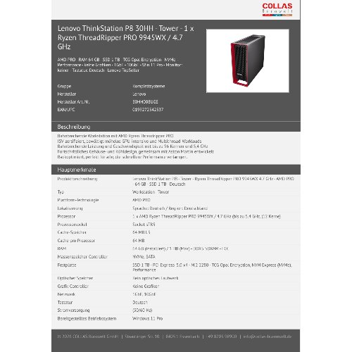 Lenovo ThinkStation P8 30HH - Tower - 1 x Ryzen ThreadRipper PRO 9945WX / 4.7 GHz