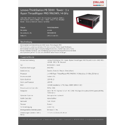 Jetzt anmeldenProduktinformationen "Lenovo ThinkStation P8 30HH - Tower - 1 x Ryzen ThreadRipper PRO 9965WX / 4 GHz"