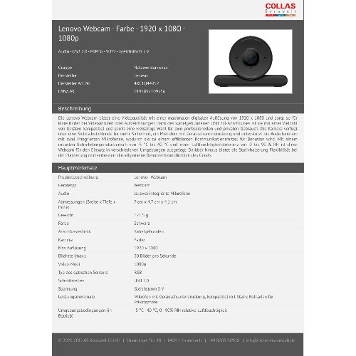 Jetzt anmeldenProduktinformationen "Lenovo Webcam - Farbe - 1920 x 1080 - 1080p"