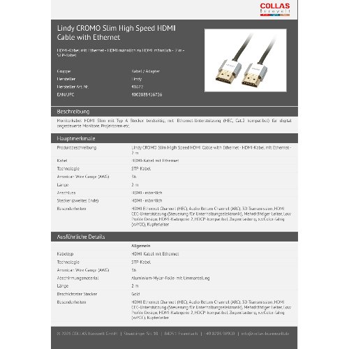 Jetzt anmeldenProduktinformationen "Lindy CROMO Slim High Speed HDMI Cable with Ethernet"
