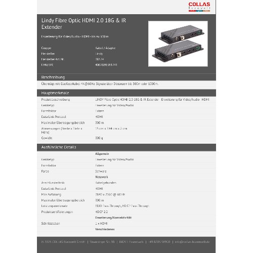 Jetzt anmeldenProduktinformationen "Lindy Fibre Optic HDMI 2.0 18G & IR Extender"