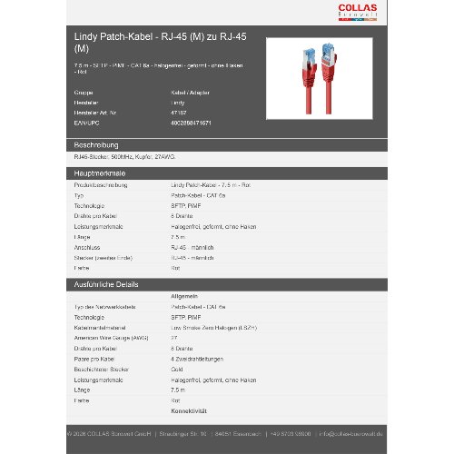 Lindy - Patch-Kabel - RJ-45 (M) zu RJ-45 (M) - 7.5 m - SFTP, PiMF - CAT 6a - halogenfrei, geformt, ohne Haken - Rot