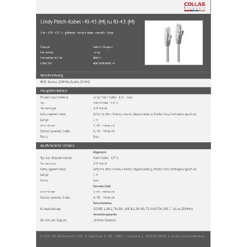 Produktinformationen "Lindy Patch-Kabel - RJ-45 (M) zu RJ-45 (M)"