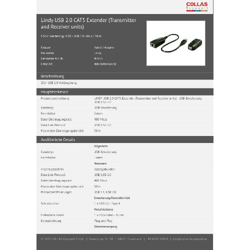 Jetzt anmeldenProduktinformationen "Lindy USB 2.0 CAT5 Extender (Transmitter and Receiver units)"