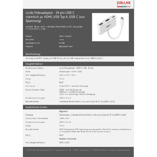 Jetzt anmeldenProduktinformationen "Lindy Videoadapter - 24 pin USB-C männlich zu HDMI, USB Typ A, USB-C (nur Spannung)"