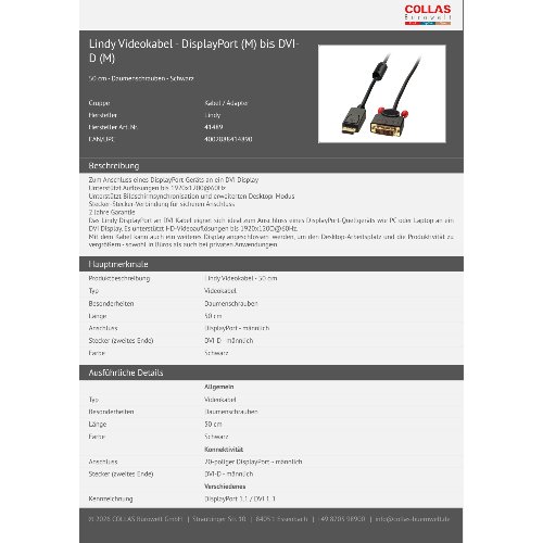 Jetzt anmeldenProduktinformationen "Lindy Videokabel - DisplayPort (M) bis DVI-D (M)"