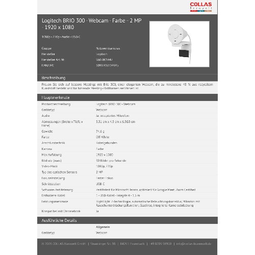 Jetzt anmeldenProduktinformationen "Logitech BRIO 300 - Webcam - Farbe - 2 MP - 1920 x 1080"