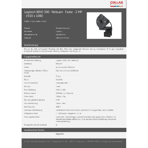 Jetzt anmeldenProduktinformationen "Logitech BRIO 300 - Webcam - Farbe - 2 MP - 1920 x 1080"