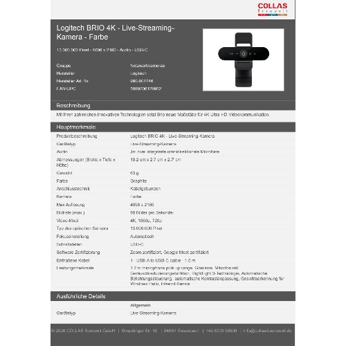 Jetzt anmeldenProduktinformationen "Logitech BRIO 4K - Live-Streaming-Kamera - Farbe"