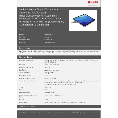 Logitech Combo Touch - Tastatur und Foliohülle - mit Trackpad - hintergrundbeleuchtet - Apple Smart connector - AZERTY - Französisch - Sand - für Apple 11-inch iPad Pro (1. Generation, 2. Generation, 3. Generation)