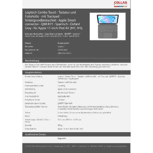 Jetzt anmeldenProduktinformationen "Logitech Combo Touch - Tastatur und Foliohülle - mit Trackpad - hintergrundbeleuchtet - Apple Smart connector - QWERTY - Spanisch - Oxford Gray - für Apple 11-inch iPad Air (M2, M3)"