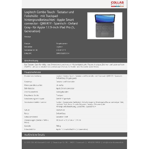 Logitech Combo Touch - Tastatur und Foliohülle - mit Trackpad - hintergrundbeleuchtet - Apple Smart connector - QWERTY - Spanisch - Oxford Gray - für Apple 12.9-inch iPad Pro (5. Generation)