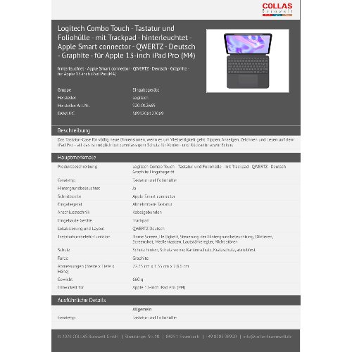 Jetzt anmeldenProduktinformationen "Logitech Combo Touch - Tastatur und Foliohülle - mit Trackpad - hinterleuchtet - Apple Smart connector - QWERTZ - Deutsch - Graphite - für Apple 13-inch iPad Pro (M4)"