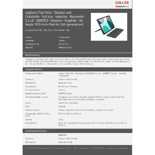 Jetzt anmeldenProduktinformationen "Logitech Flip Folio - Tastatur und Foliohülle - full size - kabellos - Bluetooth 5.1 LE - QWERTZ - Deutsch - Graphite - für Apple 10.9-inch iPad Air (5th generation)"