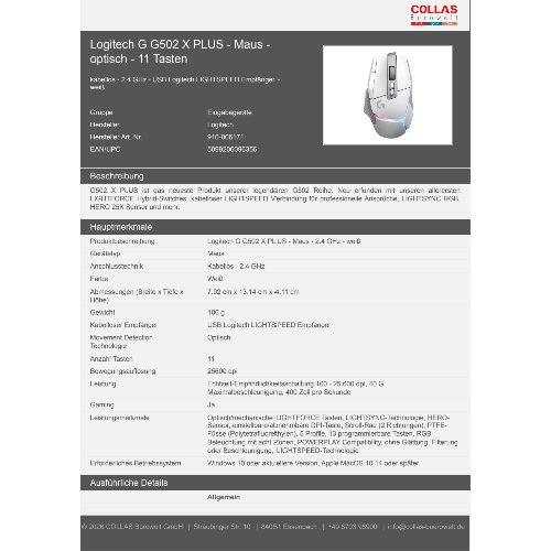 - G502 X PLUS ist das neueste Produkt unserer legendären G502 Reihe. Neu erfunden mit unseren allerersten LIGHTFORCE Hybrid-Switches, kabelloser LIGHTSPEED Verbindung für professionelle Ansprüche, LIGHTSYNC RGB, HERO 25K Sensor und mehr.