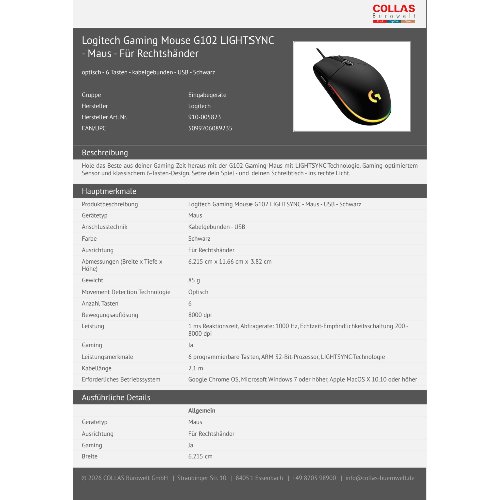 Jetzt anmeldenProduktinformationen "Logitech Gaming Mouse G102 LIGHTSYNC - Maus - Für Rechtshänder"