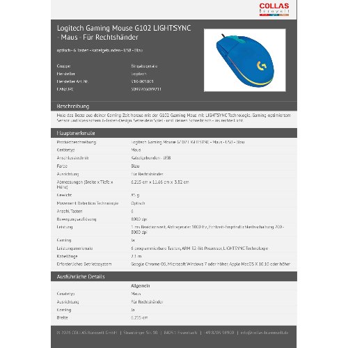 Produktinformationen "Logitech Gaming Mouse G102 LIGHTSYNC - Maus - Für Rechtshänder"