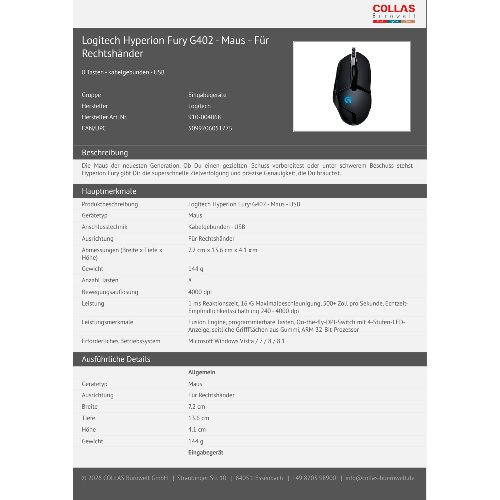 Jetzt anmeldenProduktinformationen "Logitech Hyperion Fury G402 - Maus - Für Rechtshänder"