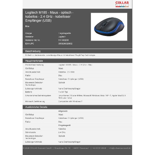 Jetzt anmeldenProduktinformationen "Logitech M185 - Maus - optisch - kabellos - 2.4 GHz - kabelloser Empfänger (USB)"