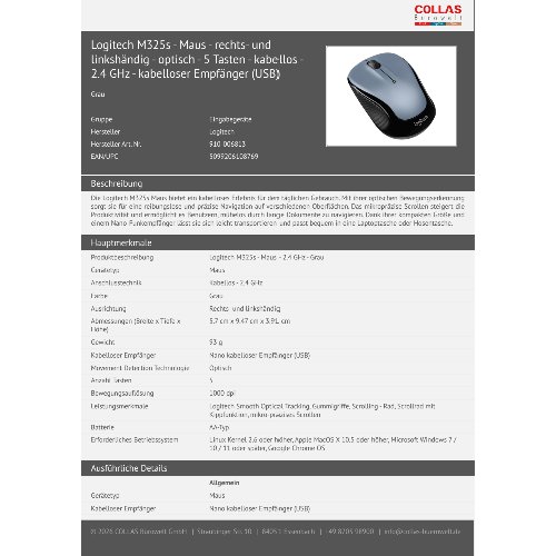 - Die Logitech M325s Maus bietet ein kabelloses Erlebnis für den täglichen Gebrauch. Mit ihrer optischen Bewegungserkennung sorgt sie für eine reibungslose und präzise Navigation auf verschiedenen Oberflächen. Das mikropräzise Scrollen steigert die Produktivität und ermöglicht es Benutzern, mühelos durch lange Dokumente zu navigieren. Dank ihrer kompakten Größe und einem Nano-Funkempfänger lässt sie sich leicht transportieren und passt bequem in eine Laptoptasche oder Hosentasche.