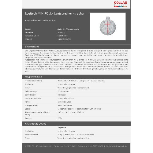 - Der Logitech Ultimate Ears MINIROLL-Lautsprecher ist für den tragbaren Einsatz konzipiert und eignet sich daher für das Hören unterwegs. Das robuste Gehäuse besteht zu 40 % aus recyceltem Kunststoff und ist daher umweltfreundlich und robust. Dank der IP67-Zertifizierung ist dieser Lautsprecher wasser- und staubdicht und kann problemlos in verschiedenen Umgebungen eingesetzt werden.Ausgestattet mit einem wiederaufladbaren Lithium-Ionen-Akku bietet der MINIROLL lang anhaltenden Musikgenuss ohne lästige Wegwerfbatterien. Der Lautsprecher lässt sich über Bluetooth für kabelloses Audio-Streaming verbinden und verfügt über einen USB Typ-C-Anschluss zum schnellen Aufladen. Unterhalten Sie Freunde und Familie mit dem PartyUp-Modus, bei dem mehrere Lautsprecher für ein verbessertes Klangerlebnis miteinander verbunden werden können. Mit einer kabellosen Übertragungsreichweite von 40 m können Nutzer mit dem MINIROLL ihre Musik genießen, ohne an ihre Geräte gebunden zu sein.