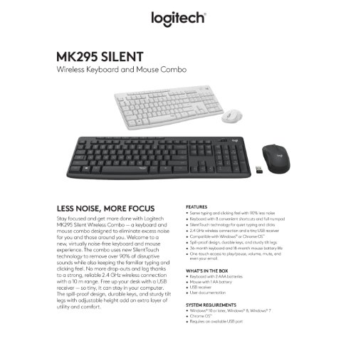 • Wir präsentieren: die Logitech MK295 Silent Wireless Combo mit SilentTouch – einer exklusiven Logitech Technologie, die über 90 % der Tastatur- und Mausgeräusche eliminiert. Damit arbeiten Sie ganz wie mit der weltweit meistverkauften Combo, aber ohne störende Klick- und Tippgeräusche.