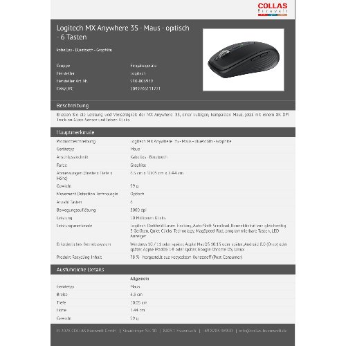 - Erleben Sie die Leistung und Vielseitigkeit der MX Anywhere 3S, einer kultigen, kompakten Maus, jetzt mit einem 8K DPI Track-on-Glass-Sensor und leisen Klicks.