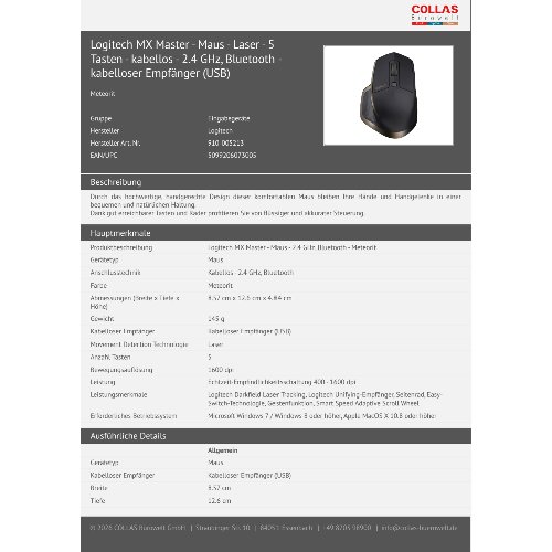 Jetzt anmeldenProduktinformationen "Logitech MX Master - Maus - Laser - 5 Tasten - kabellos - 2.4 GHz, Bluetooth - kabelloser Empfänger (USB)"