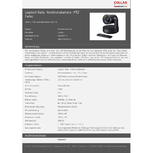 Jetzt anmeldenProduktinformationen "Logitech Rally - Konferenzkamera - PTZ - Farbe"