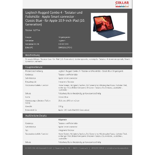 Jetzt anmeldenProduktinformationen "Logitech Rugged Combo 4 - Tastatur und Foliohülle - Apple Smart connector - Classic Blue - für Apple 10.9-inch iPad (10. Generation)"