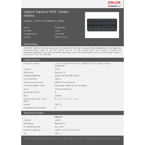 - SIGNATURE K650 ist die ideale Lösung bei Ihrer täglichen Arbeit dank verbesserten Tastenkombinationen und integrierter Handballenauflage. Holen Sie sich den Komfort, den Sie für viele Stunden Arbeit am Schreibtisch brauchen. Mit spritzwassergeschütztem* und leicht zu reinigendem Design sowie einer Batterielaufzeit von bis zu 36 Monaten**, leicht zu transportieren ohne störende Kabel.