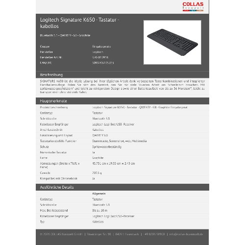 - SIGNATURE K650 ist die ideale Lösung bei Ihrer täglichen Arbeit dank verbesserten Tastenkombinationen und integrierter Handballenauflage. Holen Sie sich den Komfort, den Sie für viele Stunden Arbeit am Schreibtisch brauchen. Mit spritzwassergeschütztem* und leicht zu reinigendem Design sowie einer Batterielaufzeit von bis zu 36 Monaten**, leicht zu transportieren ohne störende Kabel.
