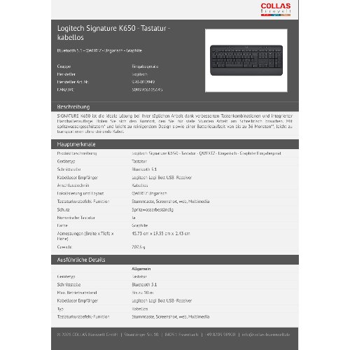 - SIGNATURE K650 ist die ideale Lösung bei Ihrer täglichen Arbeit dank verbesserten Tastenkombinationen und integrierter Handballenauflage. Holen Sie sich den Komfort, den Sie für viele Stunden Arbeit am Schreibtisch brauchen. Mit spritzwassergeschütztem* und leicht zu reinigendem Design sowie einer Batterielaufzeit von bis zu 36 Monaten**, leicht zu transportieren ohne störende Kabel.