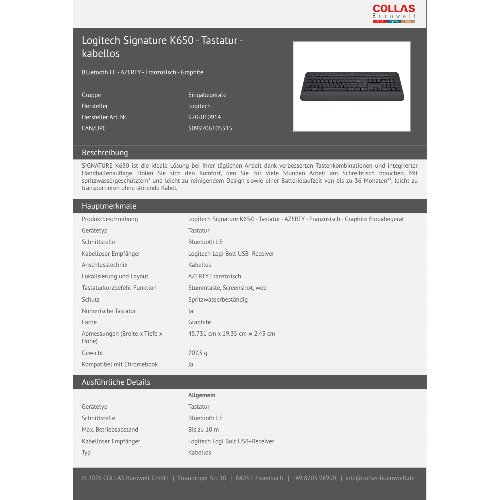 • SIGNATURE K650 ist die ideale Lösung bei Ihrer täglichen Arbeit dank verbesserten Tastenkombinationen und integrierter Handballenauflage. Holen Sie sich den Komfort, den Sie für viele Stunden Arbeit am Schreibtisch brauchen. Mit spritzwassergeschütztem* und leicht zu reinigendem Design sowie einer Batterielaufzeit von bis zu 36 Monaten**, leicht zu transportieren ohne störende Kabel.