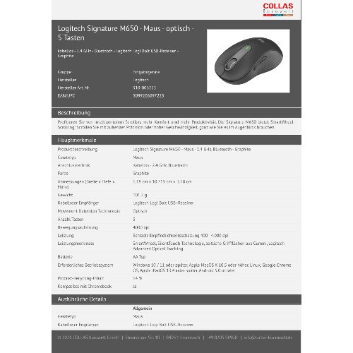 - Profitieren Sie von intelligenterem Scrollen, mehr Komfort und mehr Produktivität. Die Signature M650 bietet SmartWheel-Scrolling: Scrollen Sie mit äußerster Präzision oder hoher Geschwindigkeit, ganz wie Sie es im Augenblick brauchen.