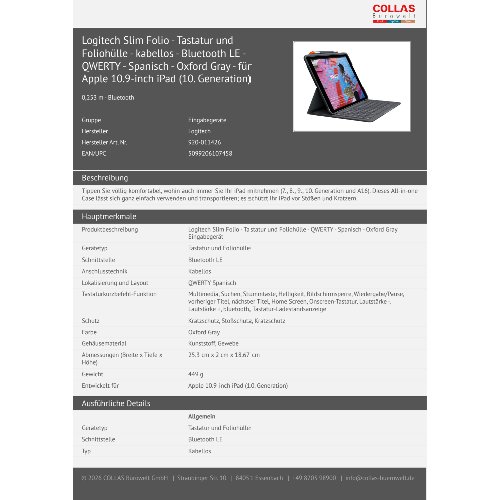 Jetzt anmeldenProduktinformationen "Logitech Slim Folio - Tastatur und Foliohülle - kabellos - Bluetooth LE - QWERTY - Spanisch - Oxford Gray - für Apple 10.9-inch iPad (10. Generation)"