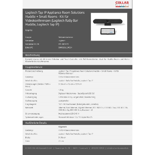Jetzt anmeldenProduktinformationen "Logitech Tap IP Appliance Room Solutions Huddle + Small Rooms - Kit für Videokonferenzen (Logitech Rally Bar Huddle, Logitech Tap IP)"